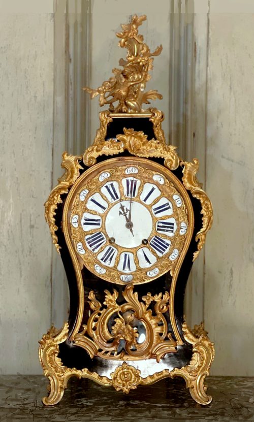 Carteluhr Rokoko Cartel Frankreich Louis XV Schwarzlack um 1750 gestempelt MONTMORENCY unter Herzogskrone – Provenienz: Herzöge von Montmorency