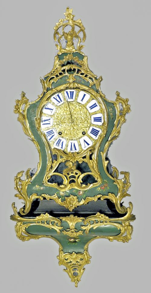 Carteluhr Wanduhr Rokoko Louis XV Frankreich um 1750 Lackmalerei « Vernis Martin » Grüner Fond mir polychromen Blumenbuketts